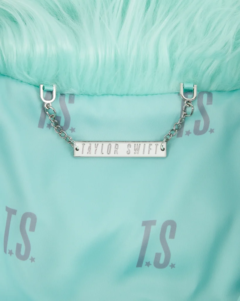 Mint green faux fur coat with clasp, metal “Taylor Swift” logo plate on interior back neck, and all over “T.S.” print logo printed in lining.